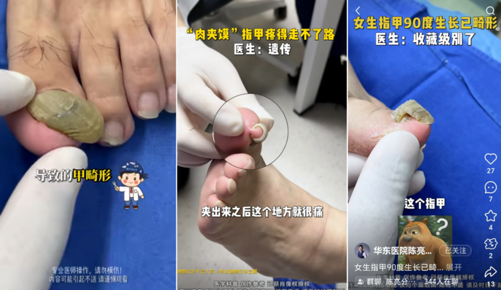 从左到右分别是陈亮接诊并制成科普视频的甲畸形、卷曲甲(钳甲)、甲畸形