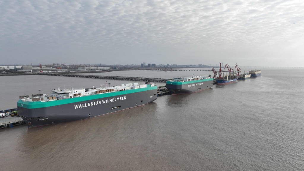 马年新春上海南港码头五船同靠 工作人员寒风中坚守保障汽车出海