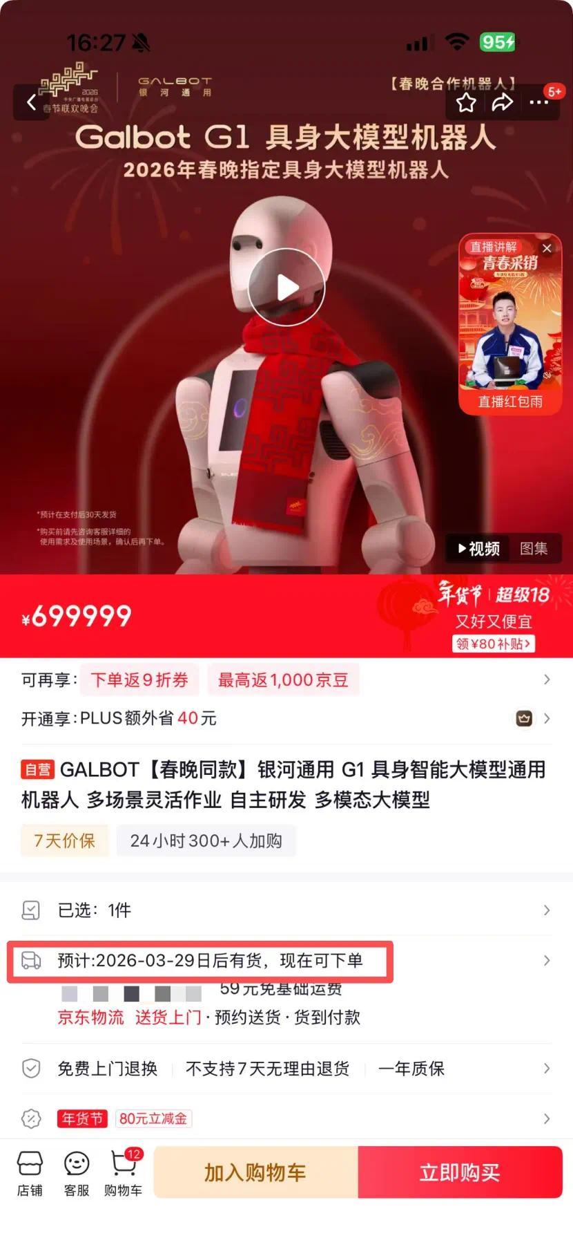 其中,银河通用价值近63万元的Galbot G1(未补贴价69.99万元)被瞬间抢空。