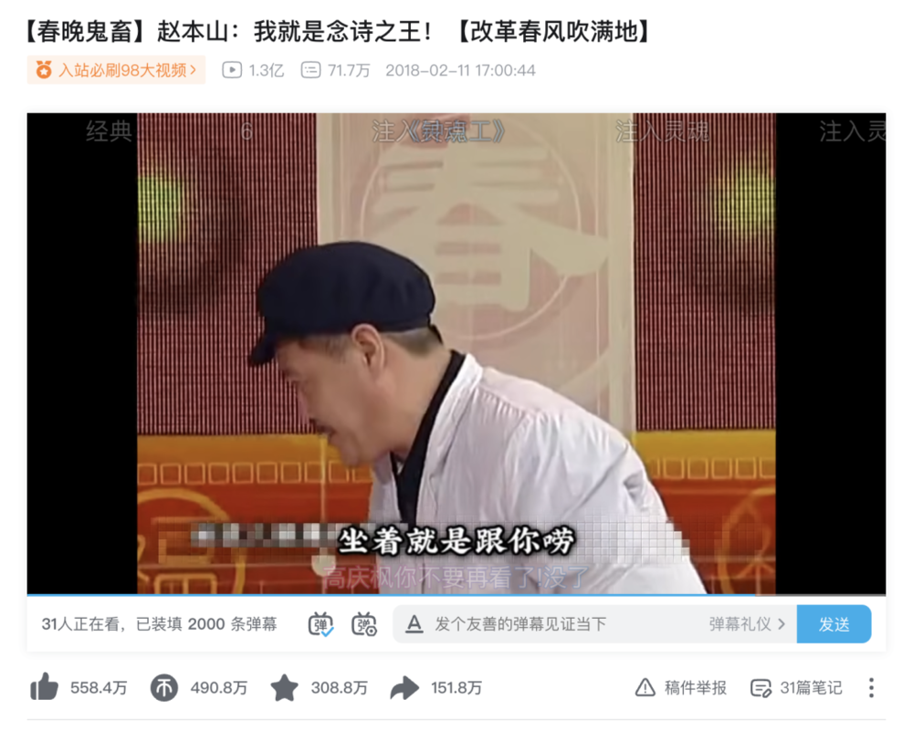 经典语言类节目总能穿越时间:“宫廷玉液酒,_______”成了年轻人的“接头暗号”;赵本山春晚作品剪辑的《念诗之王》是B站入站必看,播放量达1.3亿,随时打开都有几十人同步观看。