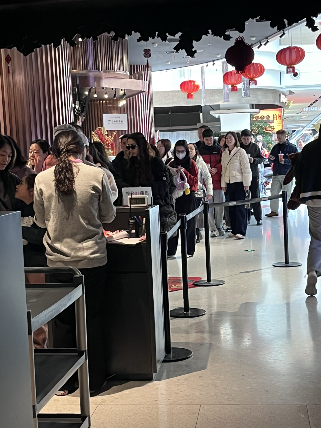 春节时商场商铺还没营业,影院却已热闹起来。取票处排起队,检票口人头攒动,红色新春装饰搭配热闹交谈,让影院成了最先“沸腾”的年味聚集地。工作人员穿着红衣,“马年吉祥”的祝福声不绝于耳。
