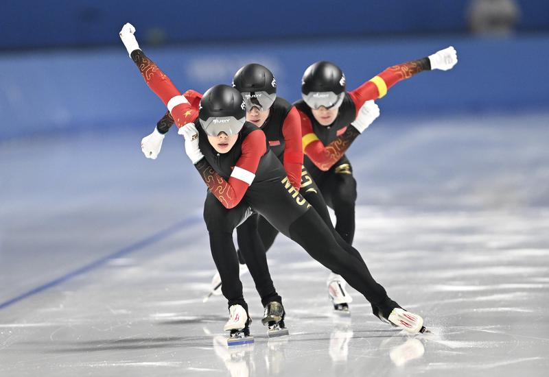 中国队选手刘瀚彬、吴宇、哈那哈提·木哈买提(从前到后)在亚冬会速度滑冰男子团体追逐决赛中(2025年2月11日摄)。新华社记者 陈振海 摄