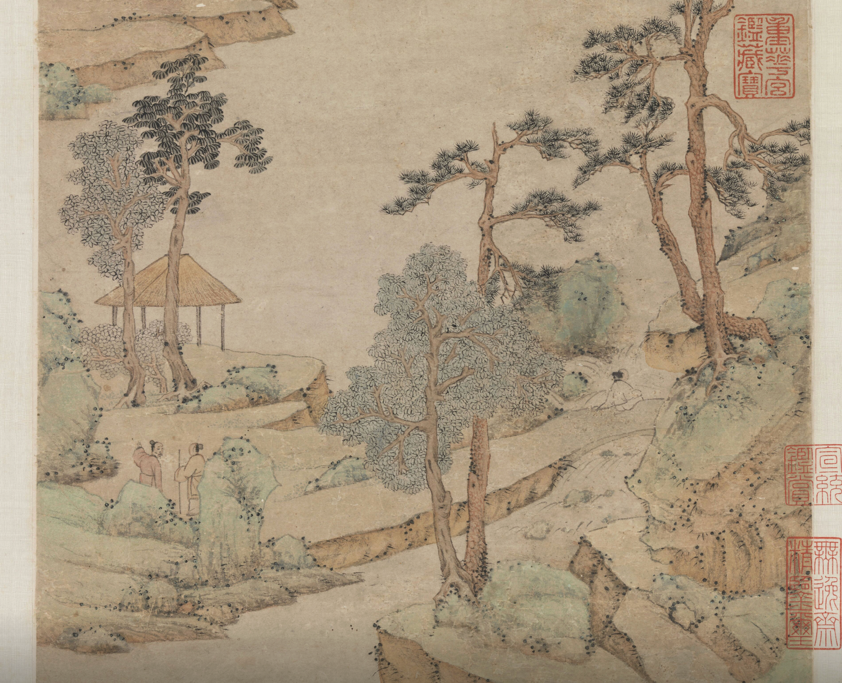 台北故宫博物院藏明代文徵明《雨余春树图》,绘尽雨后春山生机。青绿设色清雅明净,溪流蜿蜒,古松带雨,春树抽芽嫩色可人,远山云气缭绕,亭外高士策杖攀谈,满目清新舒展。自跋“雨余春树绿阴成。最爱西山向晚明。应有人家在山足。隔溪遥见白烟生”,不写雨落却处处见雨润之气,尽显雨水后万物萌动的神韵。