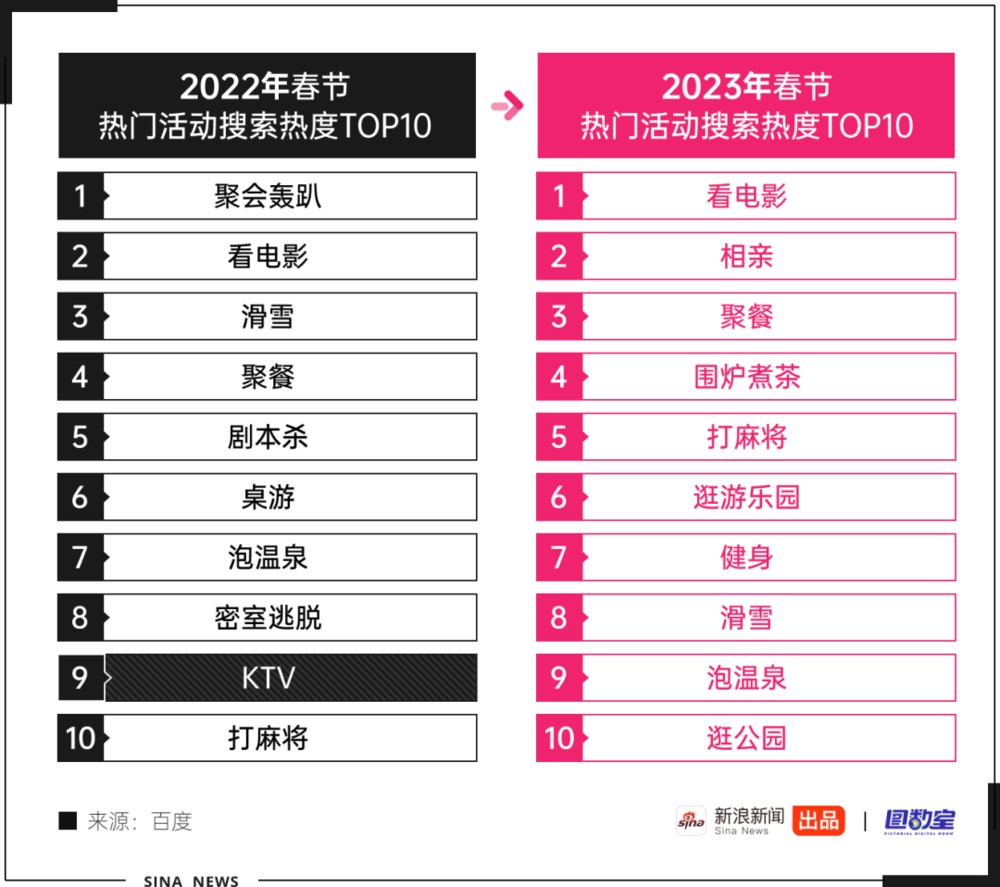 搜索数据显示,前年春节KTV还在“十大过年休闲活动”末尾;去年,大家已不去KTV,转而选择围炉煮茶、健身、游乐园等。