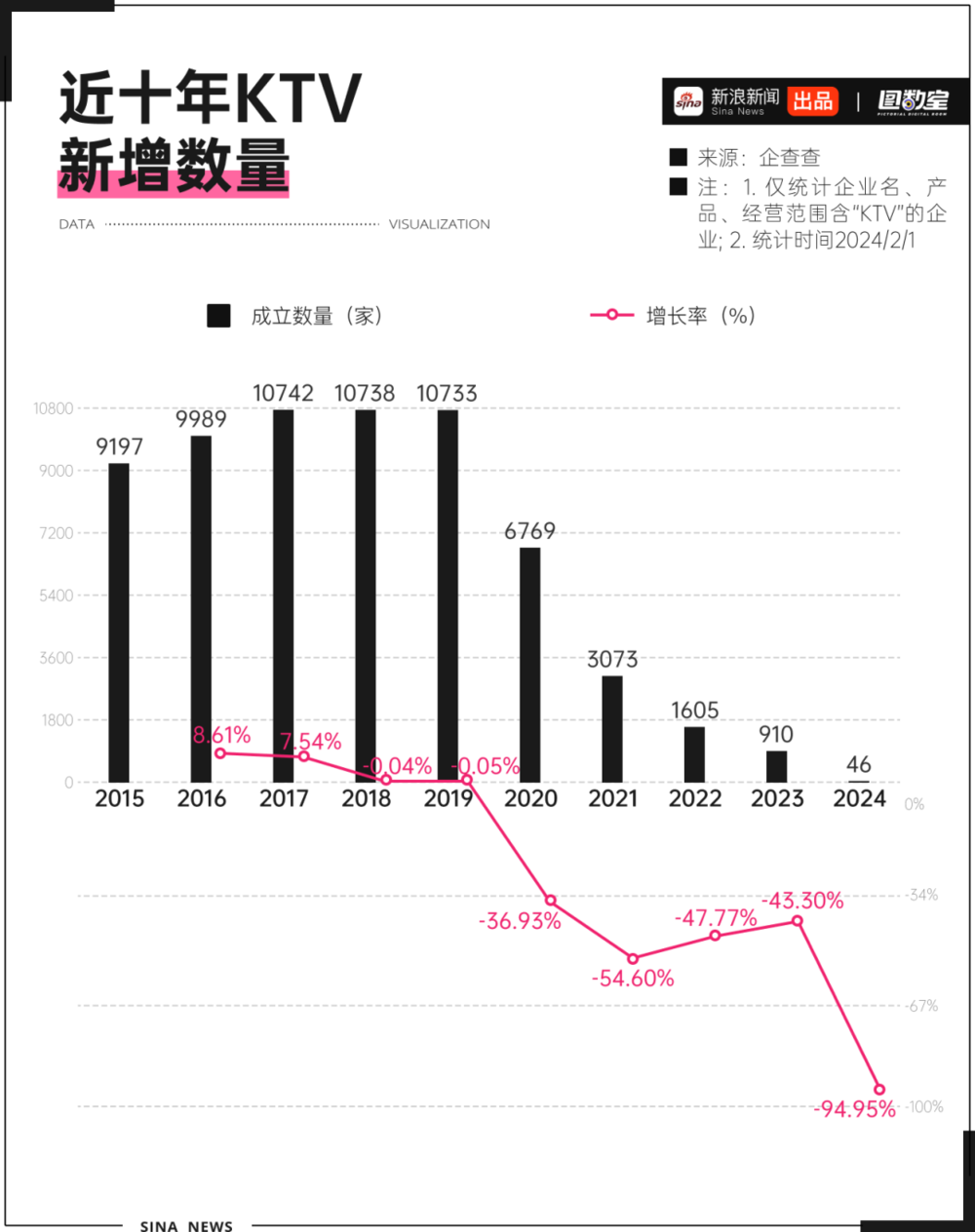 从近十年KTV新增数量来看,2017年,KTV数量增长已显乏力。2018年之后,KTV数量不增反减。2019年之后,KTV增量开始暴跌,较2018年减少了36.93%。到2023年,全国新开的KTV仅910家。