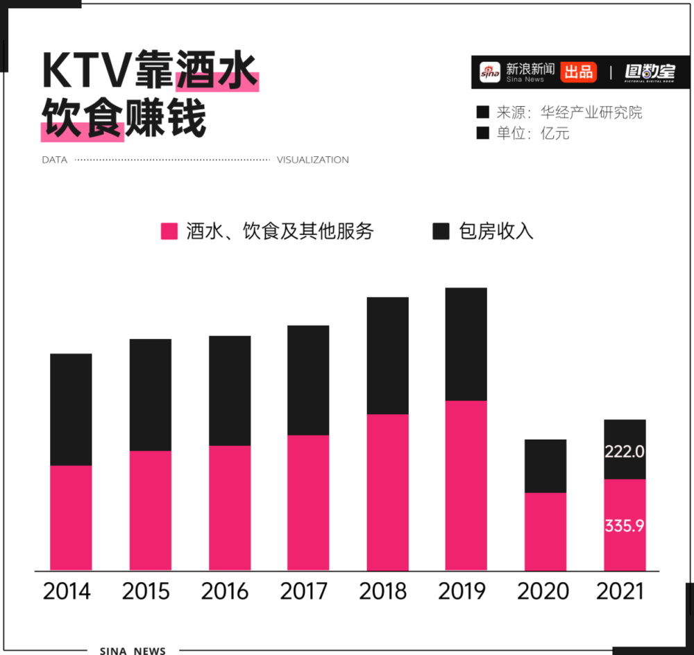 正因酒水饮食来钱快,KTV功能逐渐变化,大有从“K歌房”变“饭店”的趋势。2014年,KTV包房收入高于酒水饮食;2015年后,酒水饮食收入占比增加;2021年,酒水、饮食及其他服务规模占比达60.21%,远超包房收入。