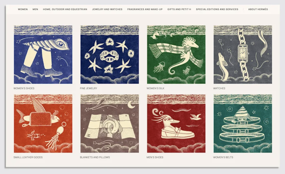 最终,这个带有纸张颗粒感与不完美线条的水下生态系统改造了整个品牌官网,让品牌门户焕然一新,足见艺术表达对爱马仕的重要性。