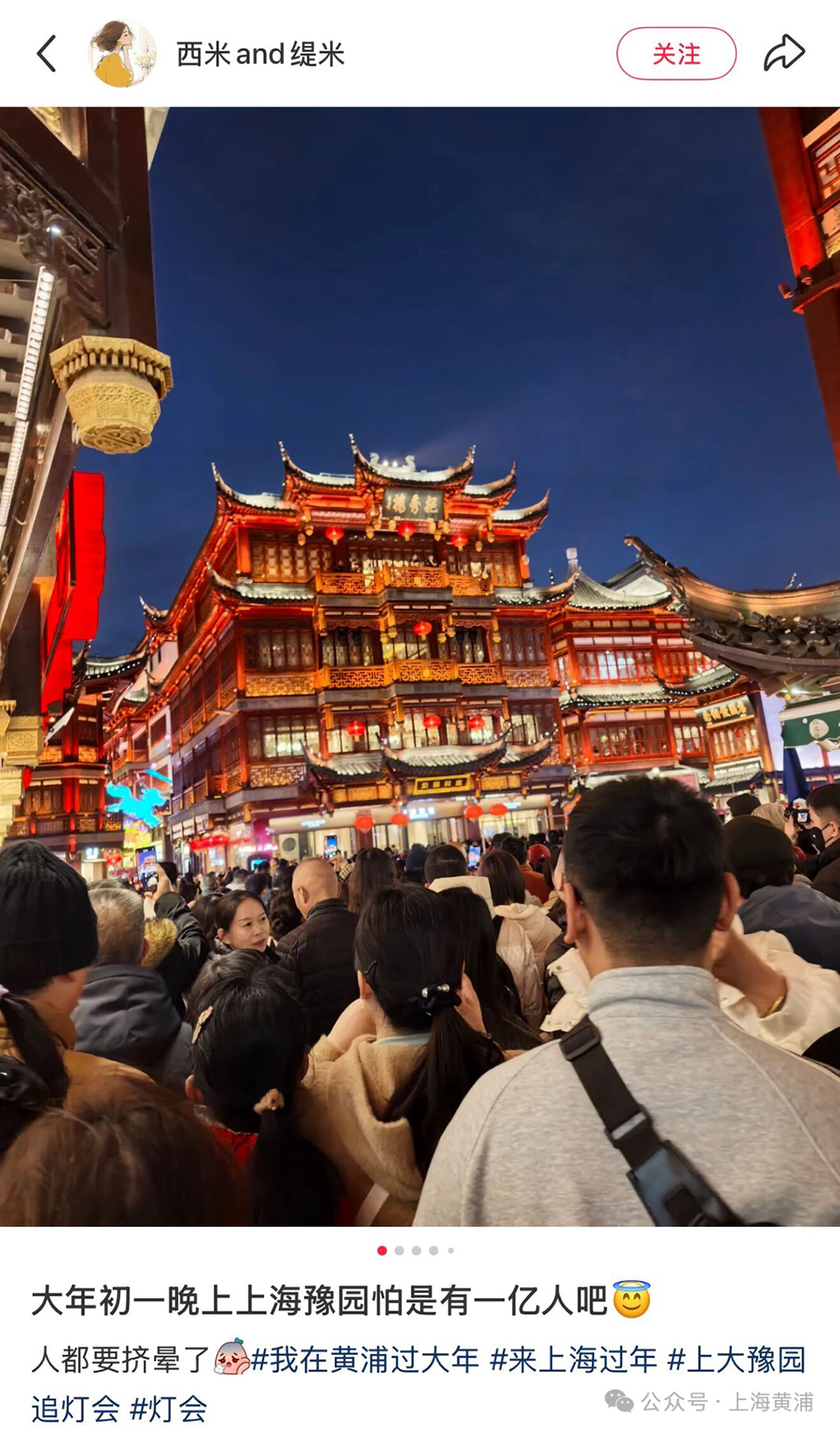 网友分享豫园人潮涌动的画面。网络截图