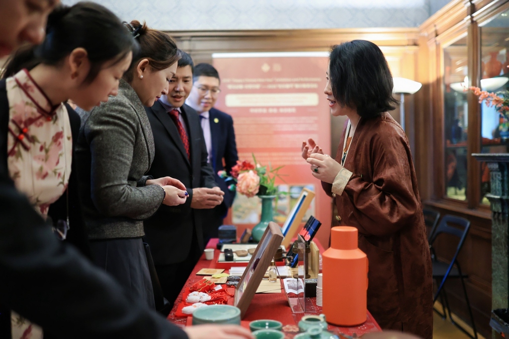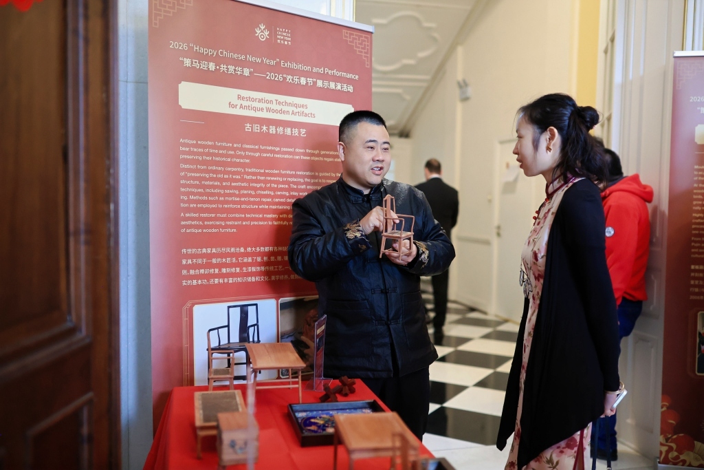 活动现场人气高涨,套板葫芦、香道茶道与海派插花、古旧木器修缮等展台前挤满了人,非遗传承人身边围满了驻足观赏、踊跃提问的当地民众。雕刻刀起落间,葫芦上的纹样逐渐清晰;茶香袅袅中,东方待客之道缓缓道来;一针一线、一凿一修间,传统工艺的细腻与匠心在众人眼前铺展。观众们在动手实践与近距离交流中,体会到春节年俗里的祝福寓意与生活情趣,感受到中国人辞旧迎新、祈愿纳福的文化传统,在欢声笑语中真切触摸到浓浓的“年味儿”。