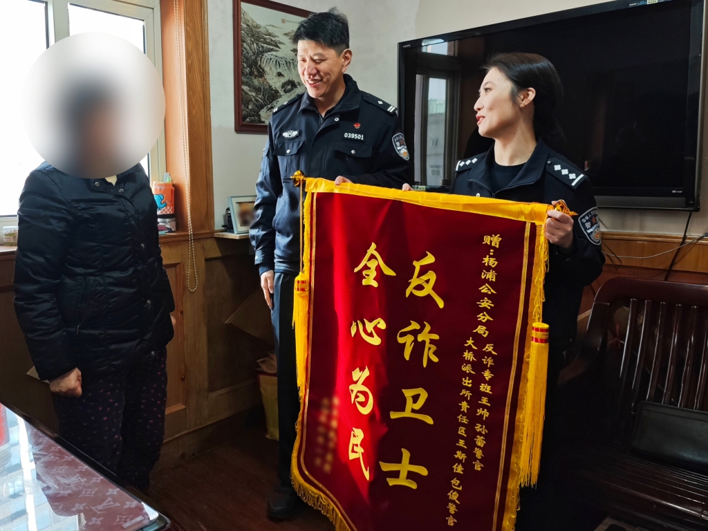 居民黄阿婆特意定制了一面“反诈卫士 全心为民”的锦旗。上海市公安局 供图