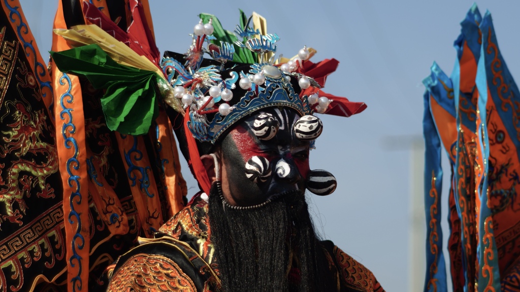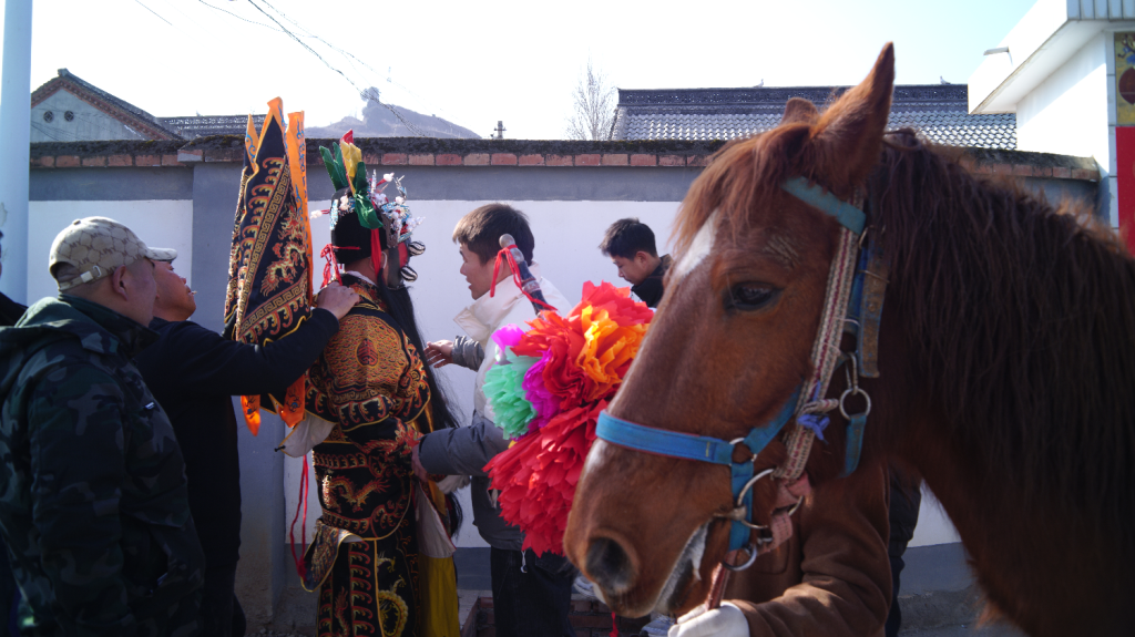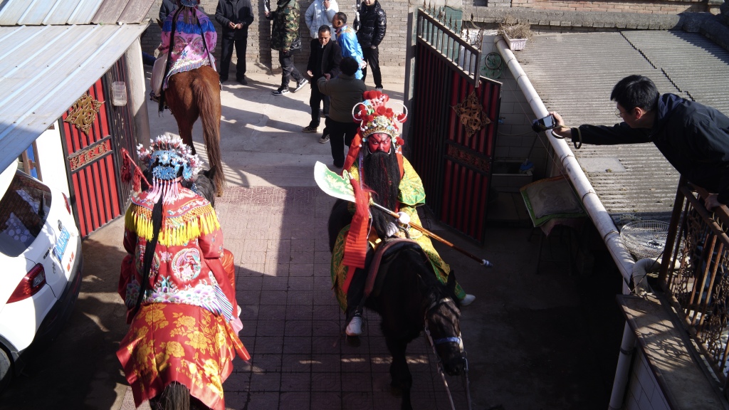 王马咀村初二游演的是马社火,故事取材于“关公保皇嫂”。队伍里除了“关公”,还有“黑虎”“灵官”“财神”等角色。主角“关公”手持青龙偃月刀在队伍末尾压阵,村民们也乐意把象征美好祝愿的红被面挂在关公刀上,这一习俗俗称“挂红”或“披红”。