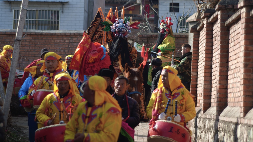 2月18日正月初二这天,陕西陇县天成镇王马咀村开展了一场社火游演活动。十多位村民精心装扮后骑上马背,在锣鼓队的带领下,挨家挨户传递新春祝福。
