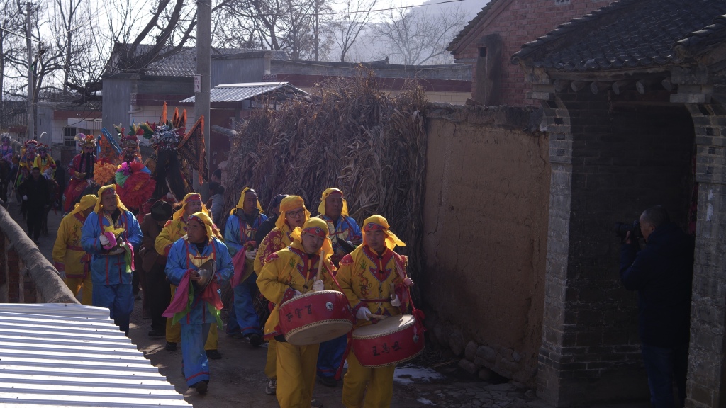 社火游演队伍挨家挨户送祝福。本文图片均为 澎湃新闻记者 王健 摄
