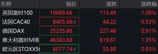 欧洲股市呈现高开高走态势,英国富时指数涨幅超1%,再创历史新高;法国CAC指数上涨0.53%,德国DAX指数涨幅达0.91%。