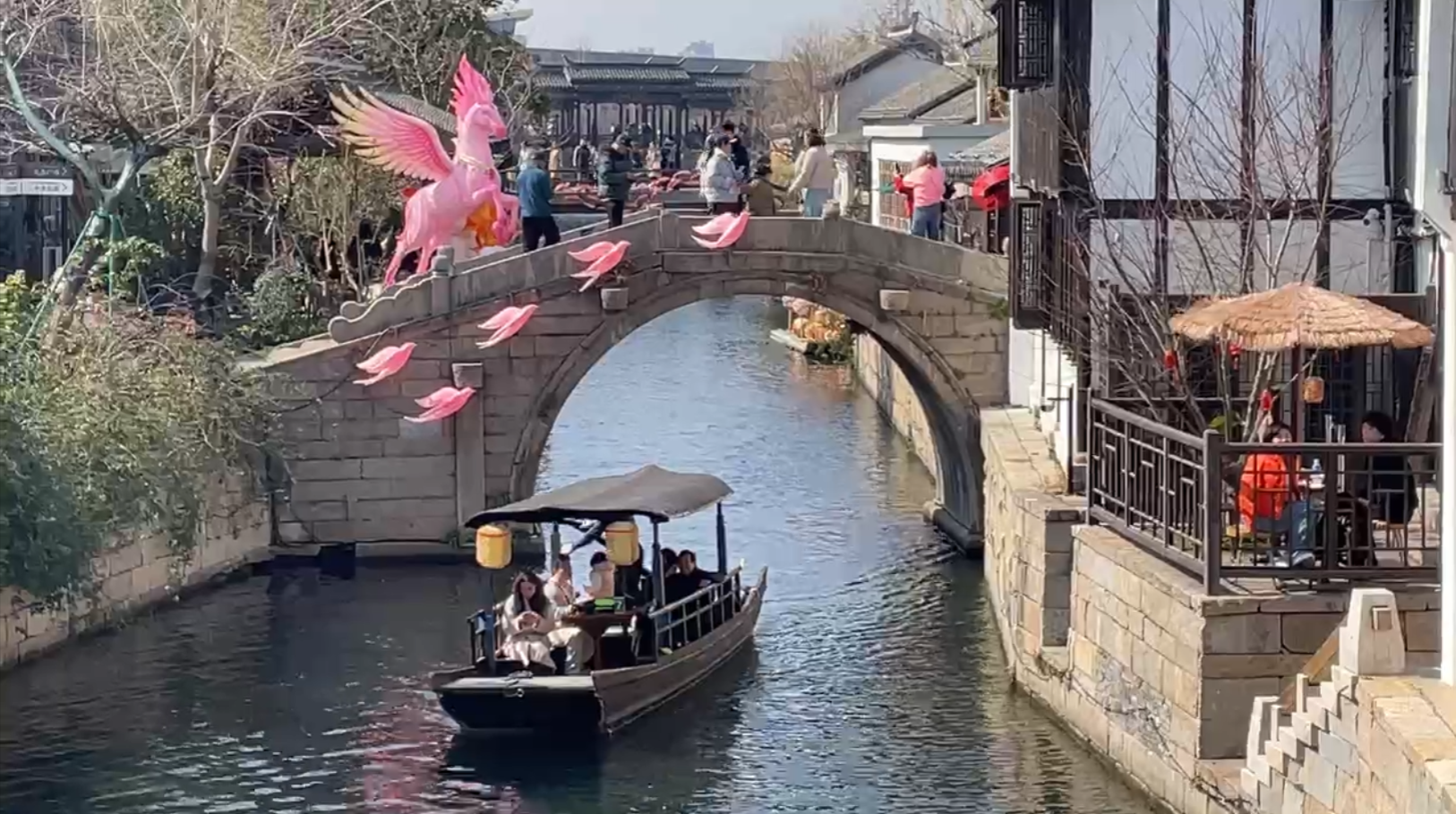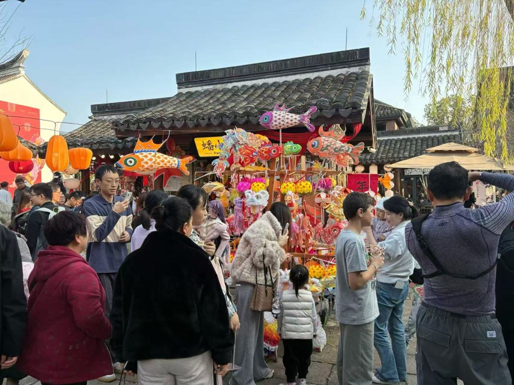 新春的蟠龙天地,灯无处不在。今年这里策划了一场盛大的水上江南灯会,邀请国内5个地区的5种非遗灯艺传承人共同创作,15余个灯会点位遍布古镇角落。在水系、古桥与街巷间,灯组与场景相映成趣,营造出独特的江南年味。