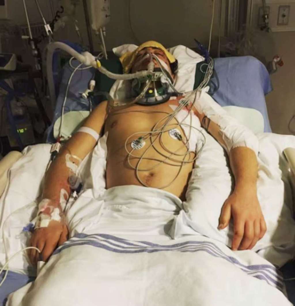 麦克莫里斯在ICU抢救的照片,他曾坦言单板滑雪赋予了自己“重生的勇气”。