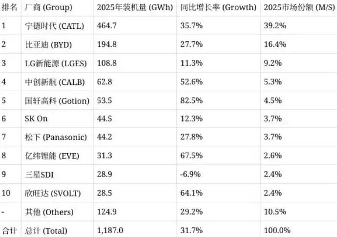 2025年,全球动力电池装机量前十名中,中国企业占据6席,市场总占有率超过70%,处于绝对统治地位。
