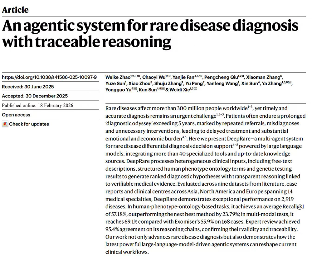 北京时间2月19日凌晨,国际顶级学术期刊《Nature》在线发表了上海交通大学医学院附属新华医院孙锟教授、余永国教授团队与上海交通大学人工智能学院张娅教授、谢伟迪副教授团队的联合研究成果——《DeepRare:An Agentic System for Rare Disease Diagnosis with Traceable Reasoning》。这款全球首个可溯源智能体式罕见病诊断系统DeepRare,凭借创新的Agentic AI架构解决了罕见病诊断的世界性难题,诊断精度创下世界纪录,相关应用已服务全球600余家顶尖医疗科研机构,为全球罕见病患者带来确诊希望,也标志着中国医工交叉创新成果跻身世界前沿。