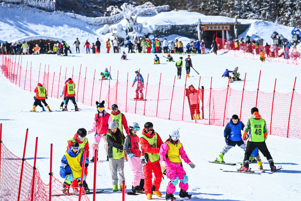 2月2日,在江西省宜春市铜鼓县排埠镇七星岭滑雪场,参加冰雪冬令营的学生在教练的带领下体验冰雪运动。新华社发(周亮摄)