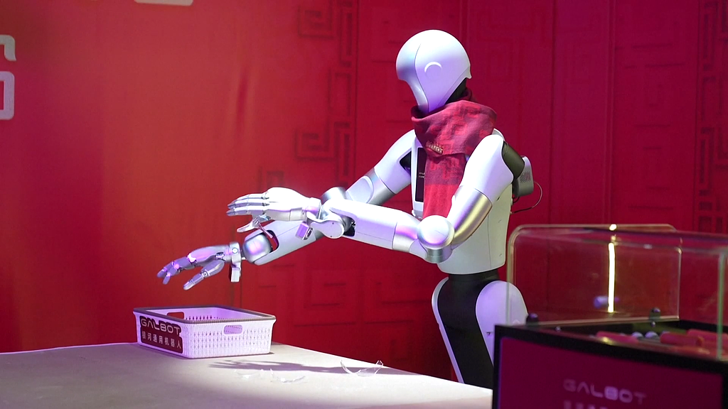 银河通用机器人在贺岁微电影《我最难忘的今宵》中与沈腾、马丽搭档,通过叠衣服、递物品、简单烹饪等场景,展示家庭服务应用能力。