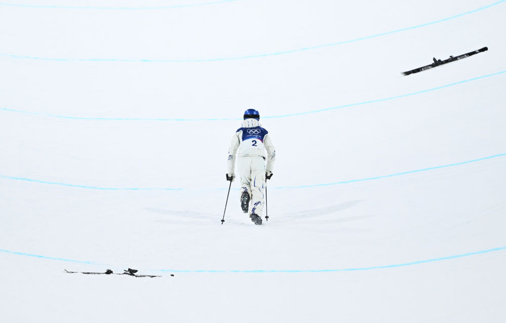 2月19日,中国选手谷爱凌在比赛中摔倒后站起。新华社记者 邬惠我 摄