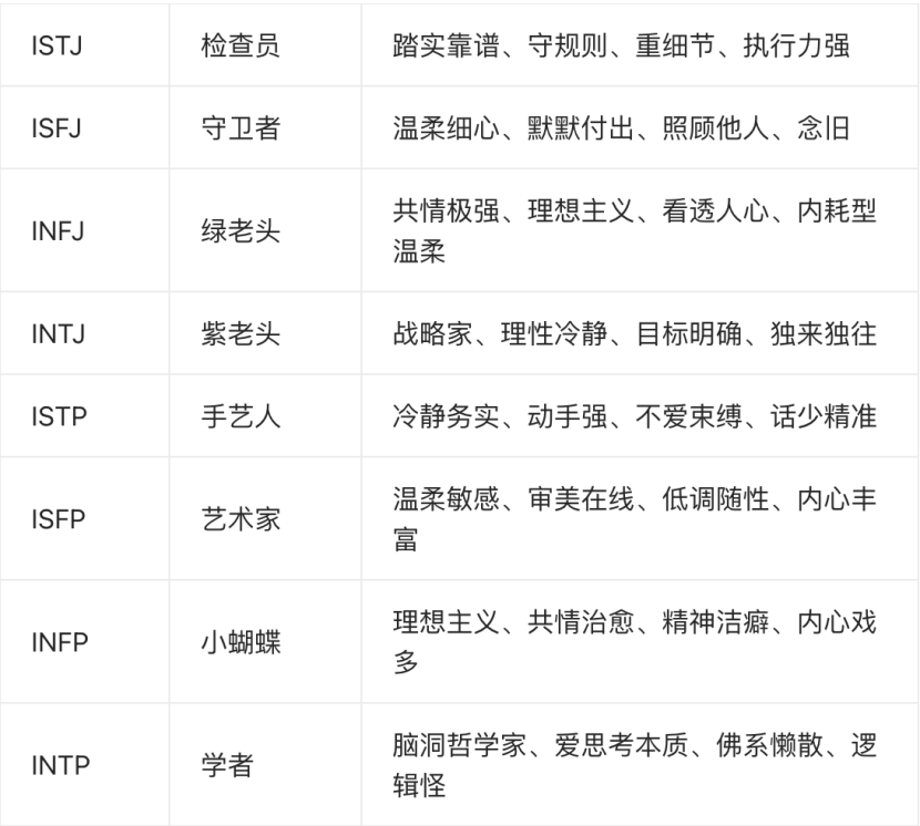 这四个维度组合出16种人格,感兴趣的朋友可以网上测试,看看自己属于哪一种。