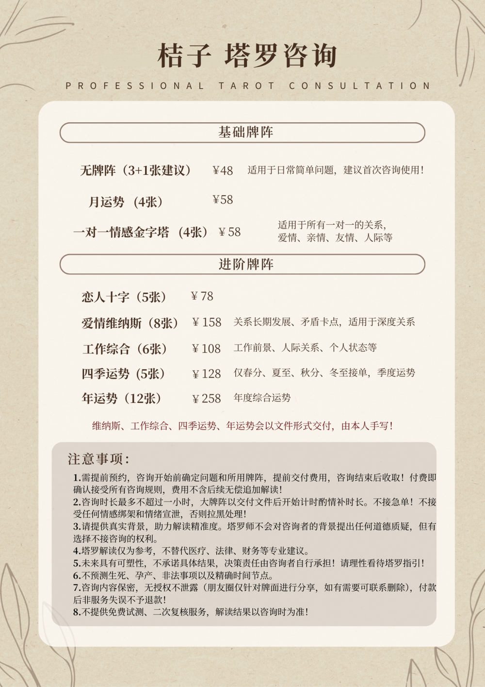 桔子的咨询套餐:48元无牌阵(日常简单问题,建议首次用);108元工作综合(8张牌,看工作前景等);158元“爱情维纳斯”(8张牌,看深度关系);258元年度运势(12张牌)。