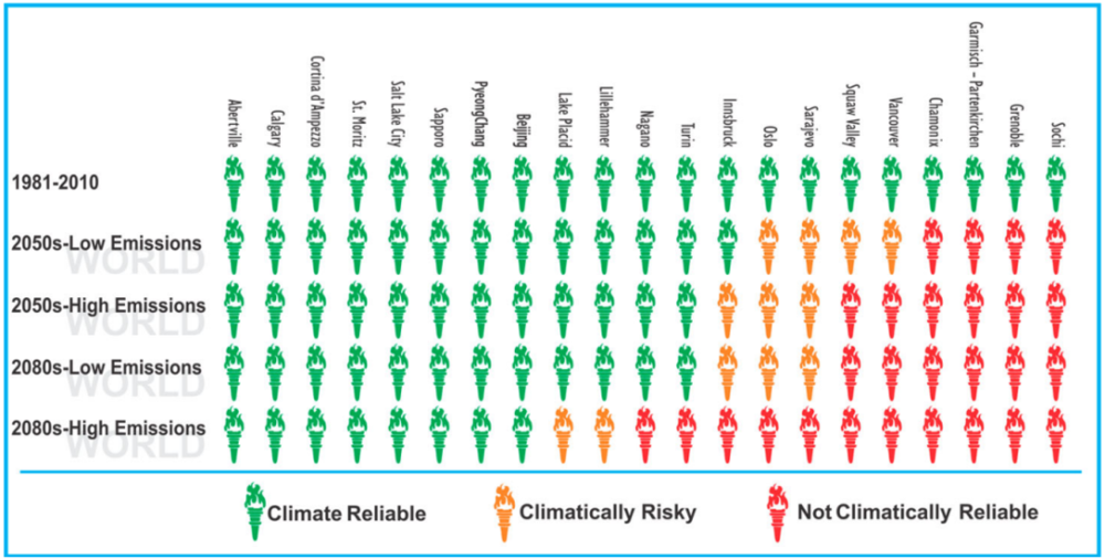 研究表明,即便按联合国设定的最佳气候情景(全球快速削减温室气体排放),到本世纪中叶,有4座往届主办城市会因气候条件不稳定无法持续承办冬奥会。若全球继续高比例燃烧化石燃料,美国加利福尼亚州斯阔谷、加拿大不列颠哥伦比亚省温哥华也将加入这一行列。到21世纪80年代,22个往届举办场地中,将有12个因气候条件不稳定,无法承办冬奥会户外项目。