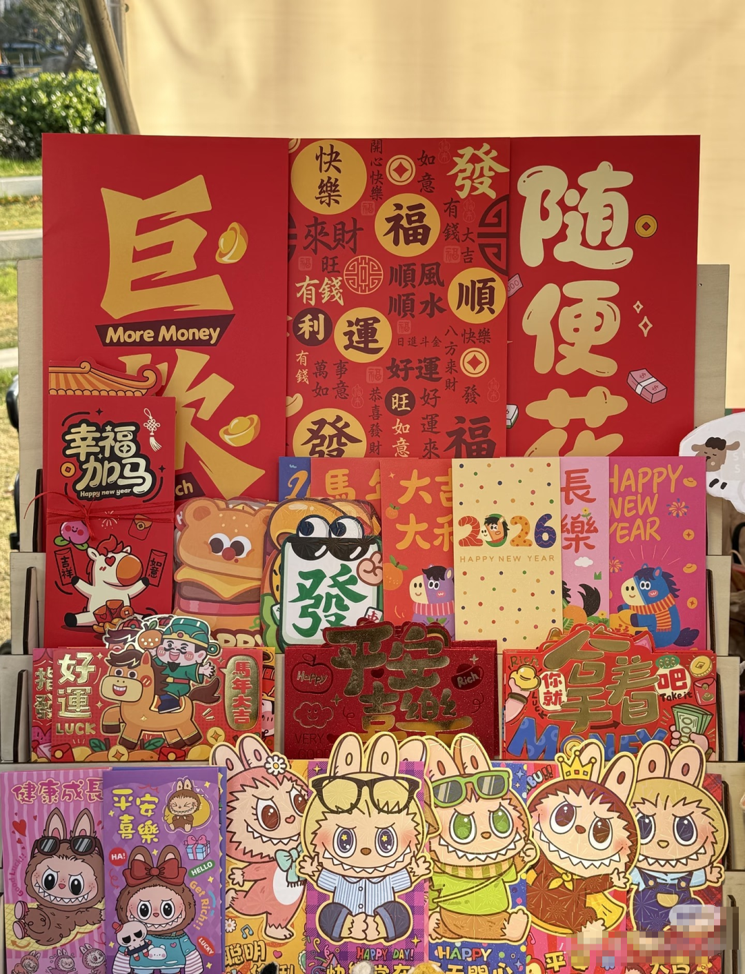 但商场里的红包大多千篇一律,她特意挑了新颖独特的款式:结合生肖与流行梗的创意设计,比如卡通马配“马上有钱”;当红IP红包Labubu款;还有针对不同人群的专属系列,如给长辈的“健康长寿”、给同事的“一包巨款”等……