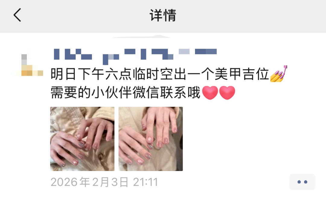 陈婷在影楼工作,擅长化妆和美甲。春节前一个月,她在老同学群和朋友圈发消息:“春节上门化妆、美甲预约开启,让你在同学聚会中惊艳全场。”