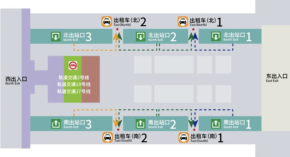 从南出站口2、北出站口2出来的旅客,可选择在出租车南1、出租车南2、出租车北1、出租车北2乘坐出租车;
