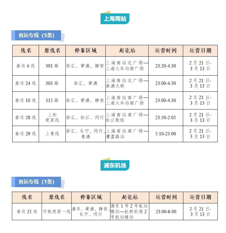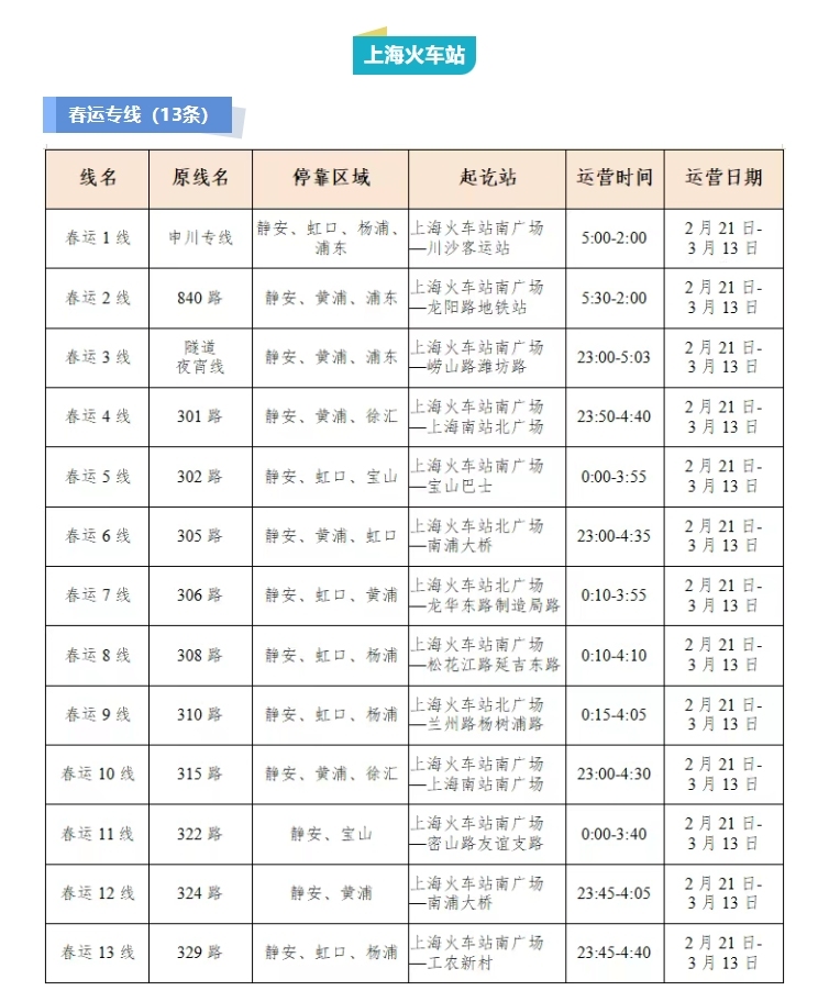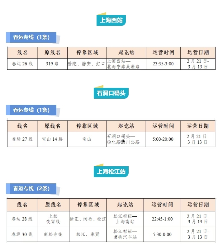 其中,上海火车站开通13条春运专线;虹桥枢纽开通10条春运专线、7条春运临时专线、4条春运定制公交线;上海南站开通5条春运专线;浦东机场开通1条春运专线;上海松江站开通2条春运专线;上海西站和石洞口码头各开通1条春运专线。