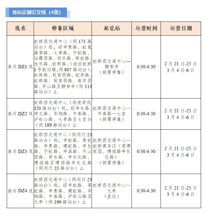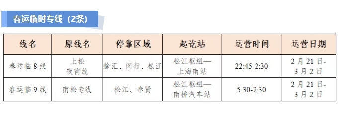 此前,“上海交通”微信号也发布消息称,为做好春运期间地面公交保障,上海公交行业开辟了30条春运专线、9条春运临时专线以及4条定制公交线,确保地面公交与机场、火车站、码头、轨交有效衔接。