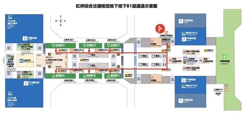 此外,虹桥火车站铁路出租车上客点分为南北两大区域,均设置在地下B1层通道两侧,各有两处入口,方便旅客快速到达。