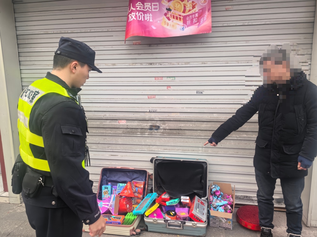 曹某将烟花爆竹放在行李箱中在路边兜售。上海市公安局 供图