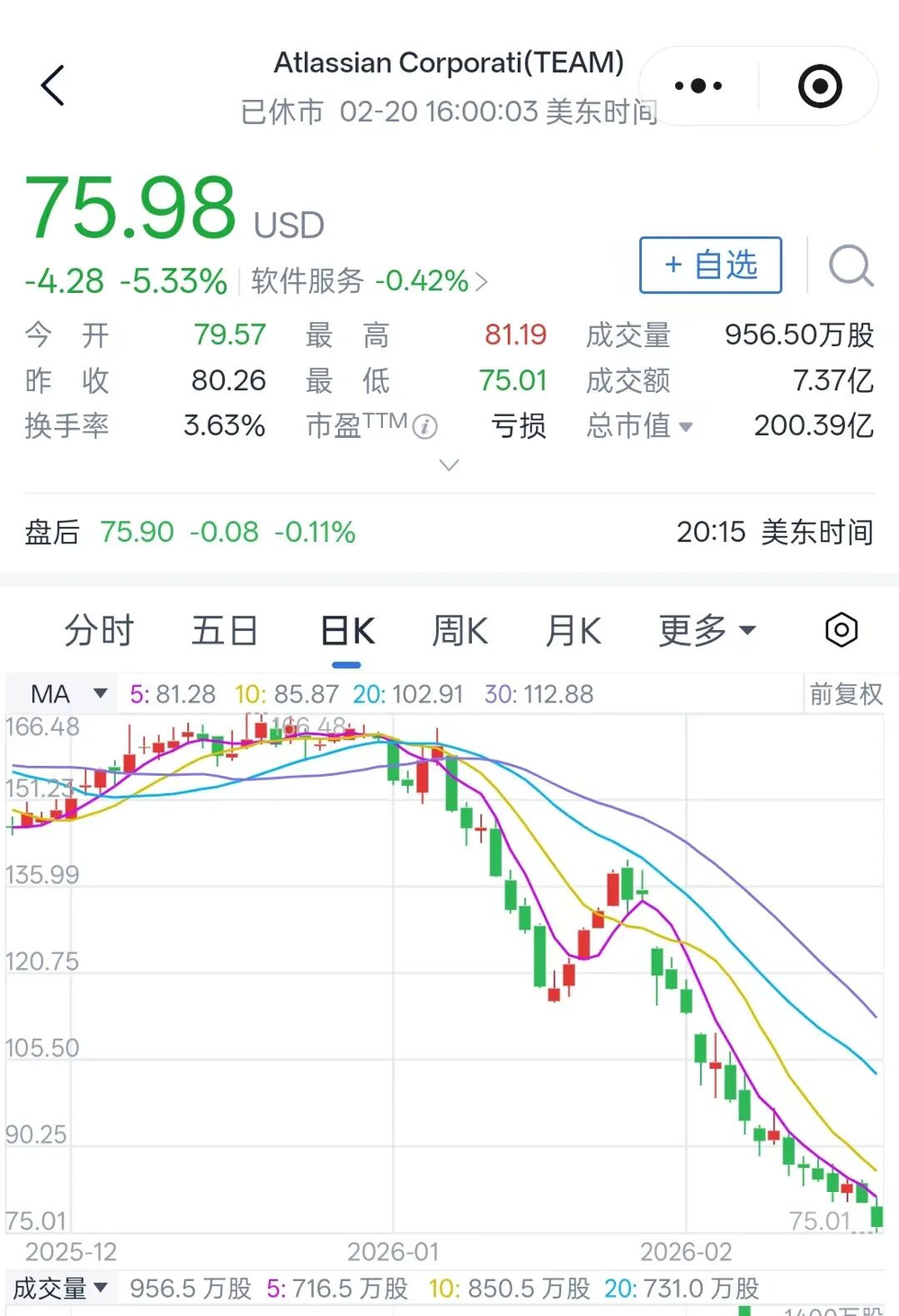 个股的冲击更为惨烈。Atlassian股价从2025年12月31日到2026年2月20日累计暴跌53.14%,澳大利亚创始人的身家大幅缩水;Salesforce截至2月20日跌幅达18.6%,市值蒸发超2100亿美元;Thomson Reuters单日下跌19%,RELX跌15%,多个细分赛道的龙头企业都承受着巨大压力。