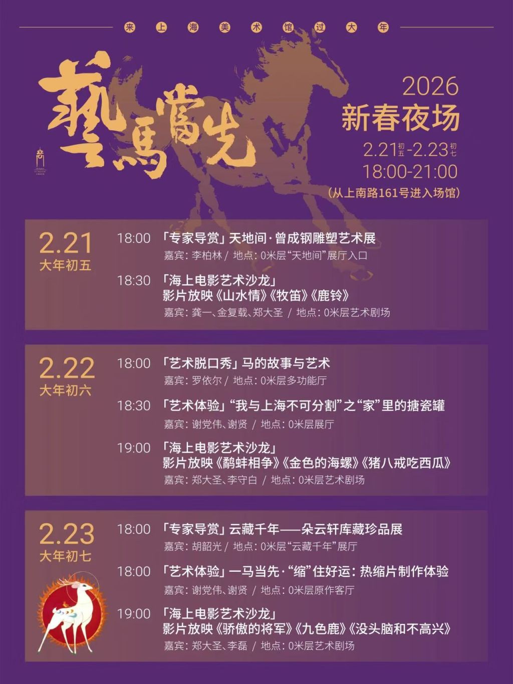 动手创造的乐趣同样不容错过:初六的“‘家’里的搪瓷罐”手作活动,让观众在亲手制作中重温老上海的城市记忆,感受老物件里的温情;初七的“一马当先·‘缩’住好运”热缩片工作坊,贴合马年新春主题,观众可以亲手制作专属的马年艺术小摆件,把新年的美好祝福“缩”在掌心。此外,初六晚由罗依尔主讲的艺术脱口秀《马的故事与艺术》,以轻松幽默的方式揭开艺术史中关于“马”的趣闻轶事,让观众在欢声笑语中收获艺术知识,为新春的艺术之旅增添别样趣味。