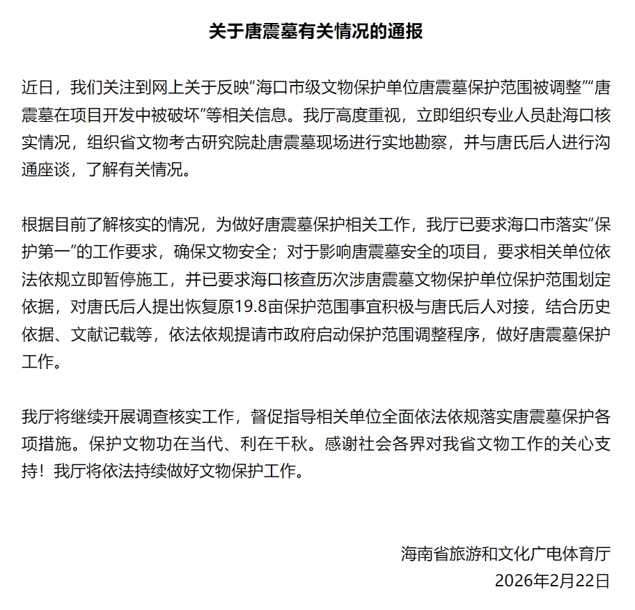 2月22日晚,海南省旅游和文化广电体育厅发布通报,针对近期网上反映的“海口市级文物保护单位唐震墓保护范围被调整”“唐震墓在项目开发中被破坏”等信息,该厅高度重视,第一时间组织专业人员赴海口核实情况,同时安排省文物考古研究院到唐震墓现场开展实地勘察,并与唐氏后人进行沟通座谈,详细了解相关情况。