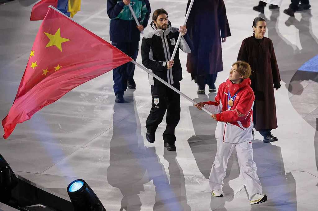 2月23日,米兰冬奥会闭幕式举行,中国代表团由苏翊鸣担任旗手。
