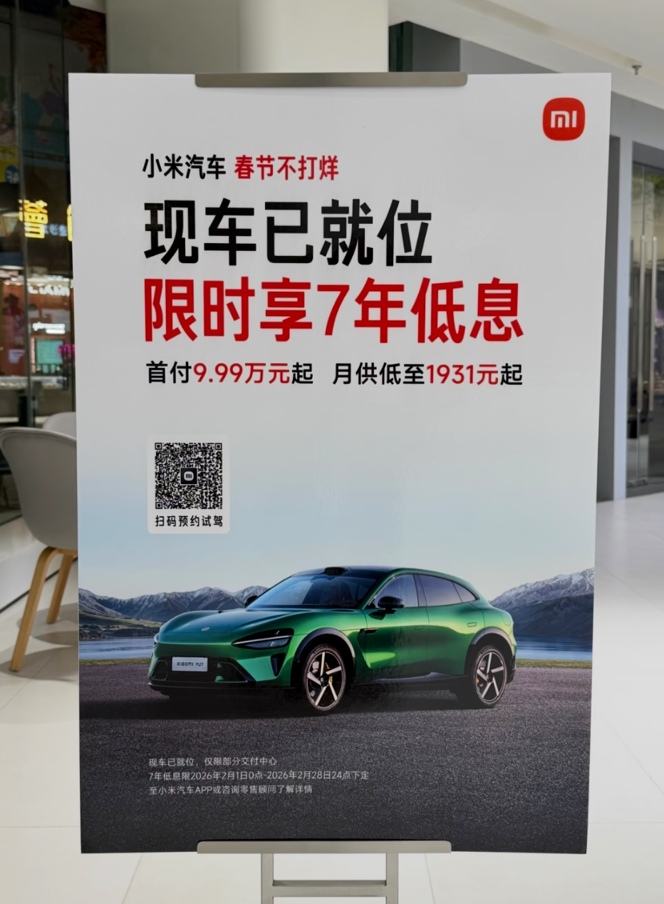销售透露,该活动节前已推出,截止到2026年2月28日。此外,YU7车型还有3年0息方案,首付7.49万,月供低至4961元。