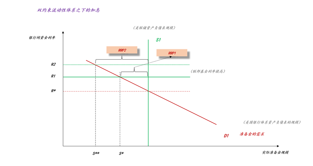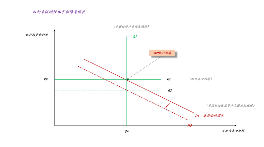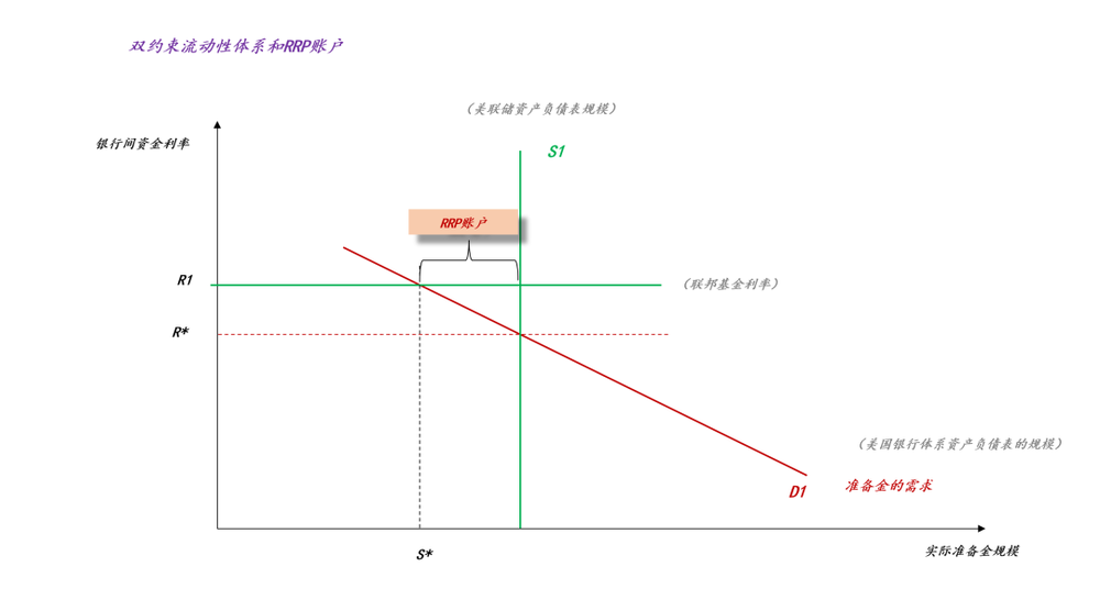于是,在美联储资产负债表的负债端,S1一部分体现为准备金S*,另一部分体现为隔夜逆回购RRP*。