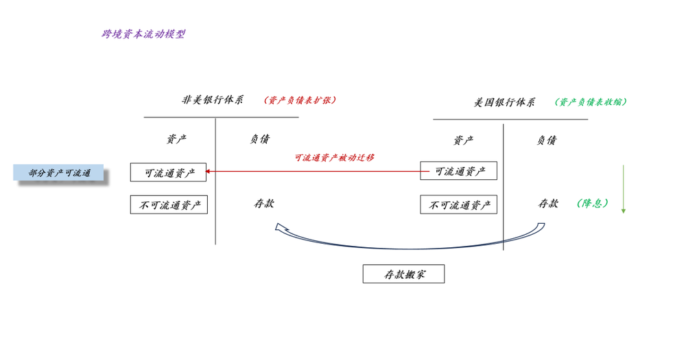 如上图所示,将美国银行体系和非美银行体系视为两家银行,当美国银行体系降息时,存款会从美国流向非美,导致美国银行体系缩表,非美银行体系扩表。