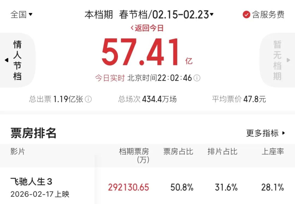 2026年春节档(2月15日—2月23日)虽有9天周期,但实际票房统计从2月17日(大年初一)影片上映开始。截至发稿,总票房达57亿,较2025年的95.1亿近乎腰斩。其中《飞驰人生3》占据半壁江山,背后是市场总量萎缩、结构分化,以及观众“先看评分再购票”的理性消费习惯。