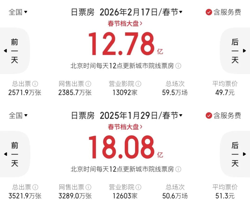 2月17日(大年初一)春节档总票房12.78亿,较2025年首日的18.08亿有所缩水,2478万观影人次也大幅下降。