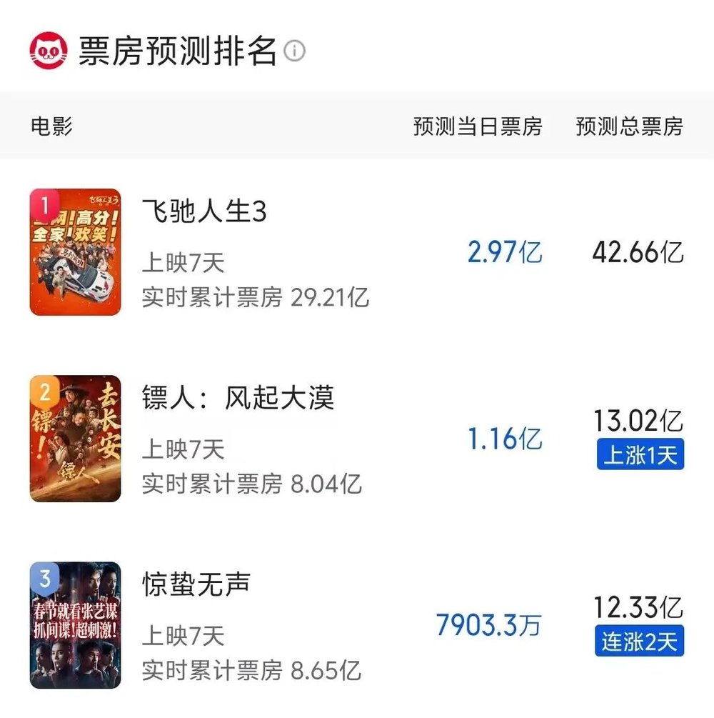 《镖人:风起大漠》上映前引发争议,但质量扎实,票房逆跌后排名从第四升至第二,男性观众占比增长;《惊蛰无声》同样如此。不过,二者与《飞驰人生3》差距明显,猫眼预测总票房均在12-13亿,离目标较远。