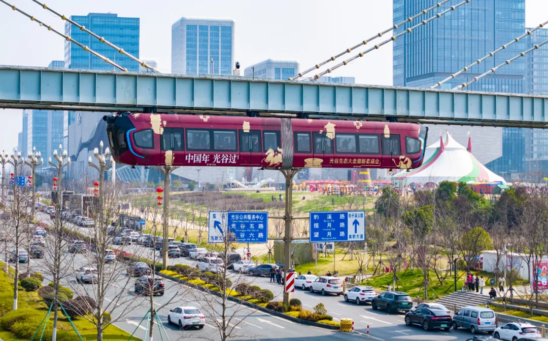 2月19日,大年初三,光谷空轨新春主题列车满载游客穿行在中央生态大走廊上空。(记者 魏徕 摄)