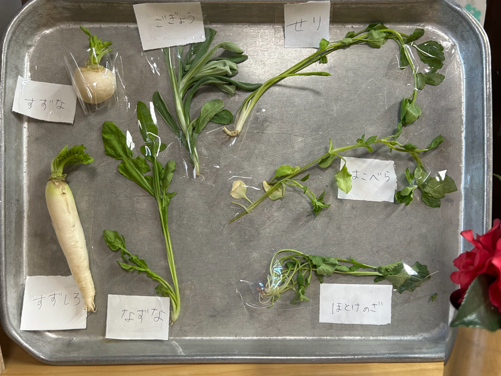 1月7日,保育园煮七草粥,这是老师在入口处展示的七种春蔬