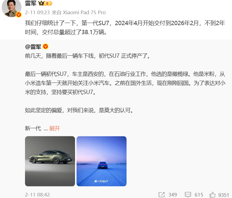雷军官宣第一代SU7停产:一个爆款时代落幕,新征程开启