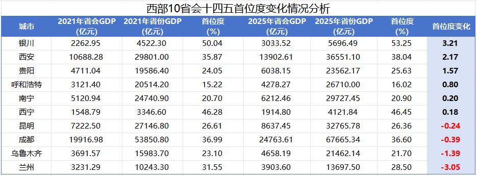 这里需要澄清一个常见误区。近年来人们谈论“强省会”时,常以“首位度”为标准,但这一指标有很大误导性。比如银川、长春、西宁的“首位度”最高,GDP占全省比重接近或超过一半,但它们能被称为“强省会”吗?显然不能。