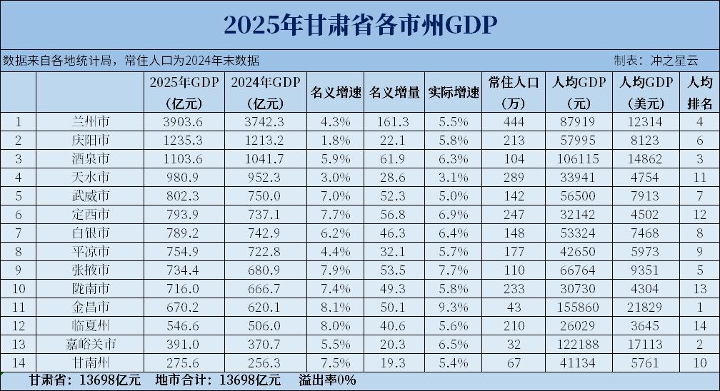 数据显示,目前甘肃省内仅兰州GDP超过3000亿元,排名第二、第三的庆阳和酒泉刚过千亿门槛。